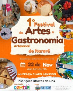 O COMTUR, em parceria com a Prefeitura de Itararé e a Associação dos Artesãos de Itararé, CONVIDA você — cozinheiro(a), doceiro(a), produtor(a) rural ou quem faz aquele queijo especial — a participar do Festival Gastronômico de Itararé, que acontecerá no dia 22/11/25, na Praça Claro Jansson.